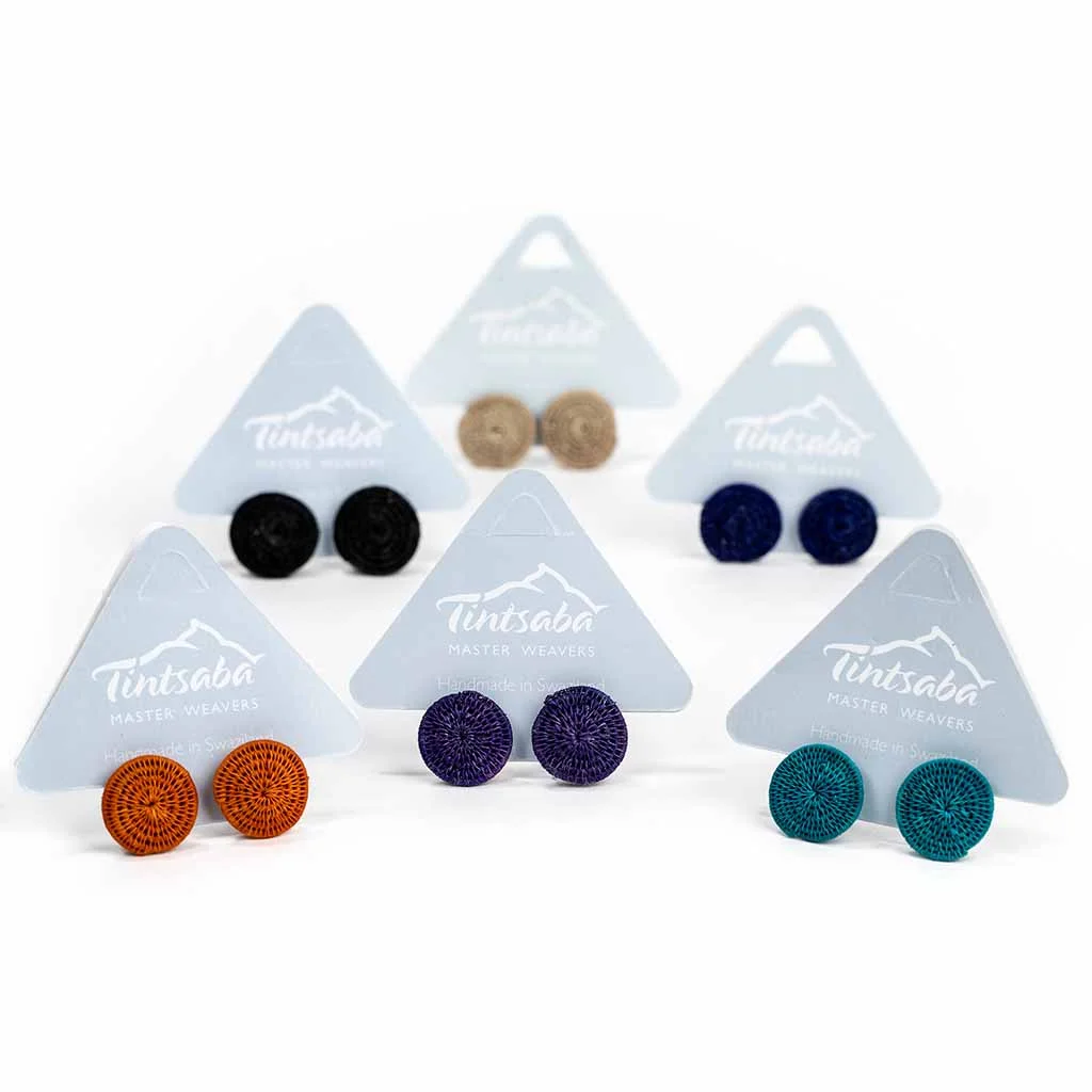 From the master weavers in Swaziland these neat earrings will match any outfit. In a range of vibrant colours. For pierced ears and with stainless steel mounts.
